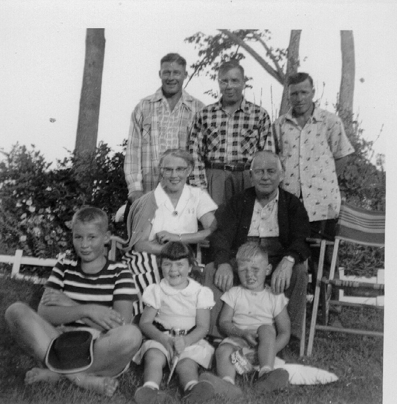 | Gramma Reid with Her Sons (L-R) Earl, Ivan and my Dad- Walter That's Grandad Reid- Norm, next to her. Three "early" Grandkids- Tom, Judy and me (down front right) |